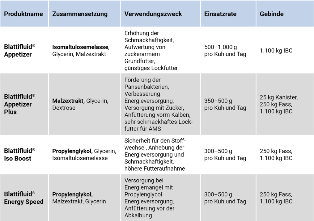 Zur verbesserten Zuckerversorgung bei Rationen mit einem zu knappen Zuckergehalt oder zur Verbesserung der Schmackhaftigkeit kann Blattifluid® Appetizer in die TMR eingemischt werden. Dieses Flüssigprodukt aus dem Blattifluid®-Programm kann auch als günstige Alternative als Lockfutter im AMS eingesetzt werden.